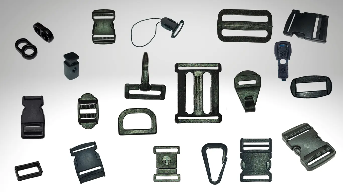 Galanterijski in tekstilni dodatki: Različne izvedbe zaponk, karabinov, regulatorjev, gumbov in zavor za vrvice.